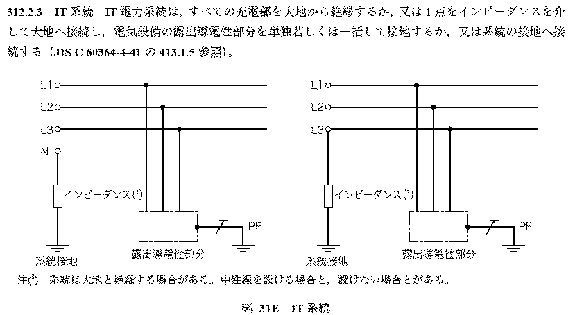 る。)AC 100V 系ではその片側が、また AC 200V 系では中点が配電変圧器 (柱上変圧器) において接地されているが、通常は保護接地導体は負荷には供給されない。(比較: 欧州の単相電源系統では、電源系統で相の一方を接地し、かつ電源導体と独立した保護接地導体を負荷に供給する、 TN-S システムが用いられることが多い。 )